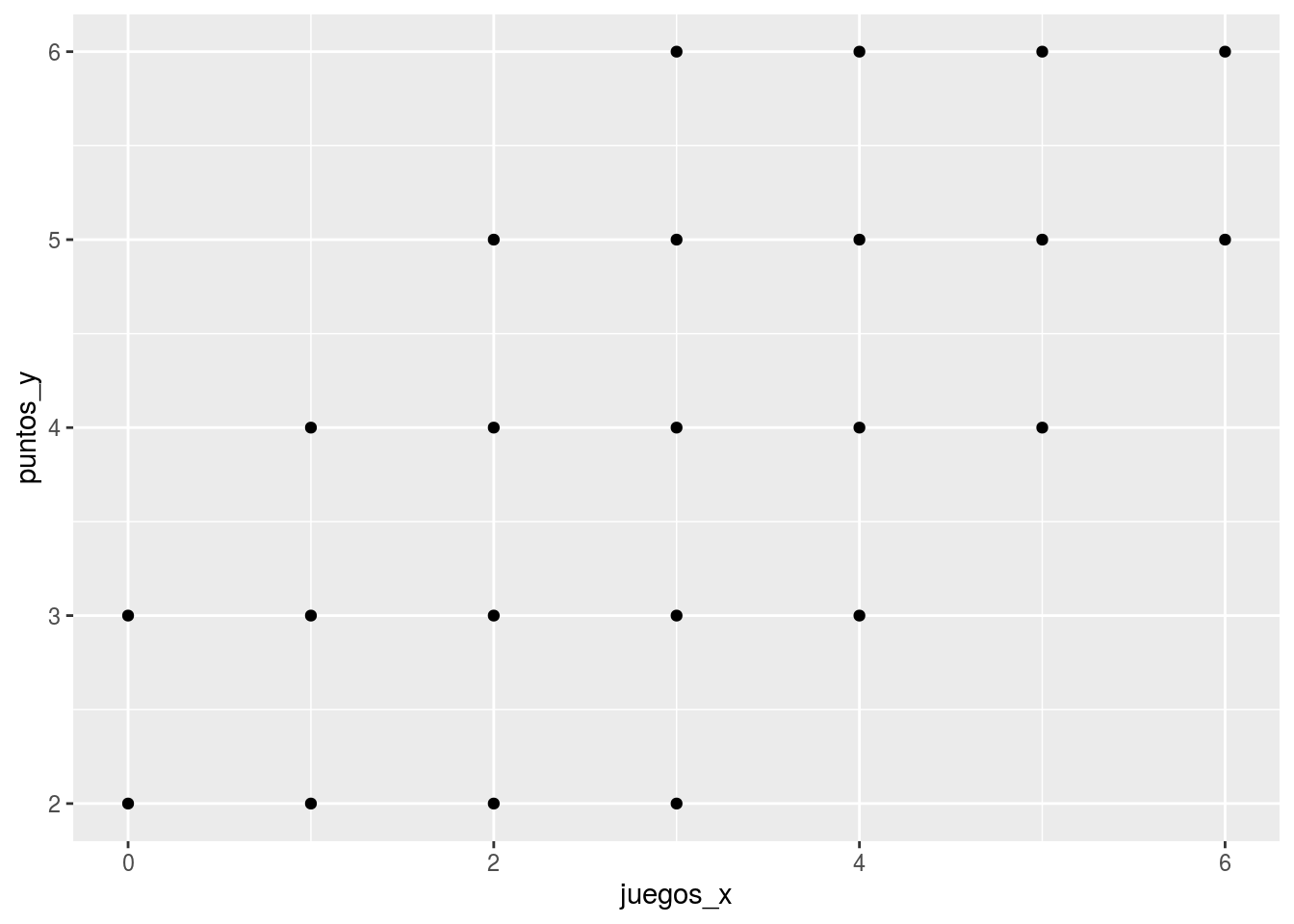 En la tabla vemos los estadísticos básicos de las variables juegos y puntos, y además aparece la variable id, que es el identificador y por lo tanto no tiene sentido que salga en la tabla. Para corregir, seleccionamos las variables de interés de datos con el operador pipa %>% operador pipa %>%. Este operador permite unir distintas funciones en una misma línea de código, y es muy utilizado por librerías de manejo de datos como dplyr. Por ejemplo, ahora la instrucción es “de la base de datos datos” %>% “selecciona solo las columnas juegos y puntos”: