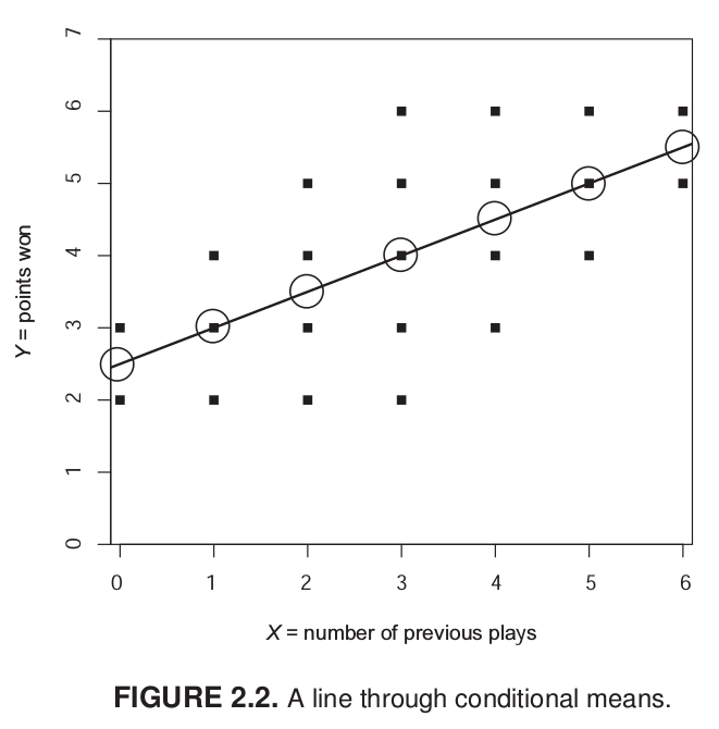 Mirando el gráfico de nube de puntos, sabemos que tres personas han jugado antes una vez, pero una de ellas tuvo 2 puntos, otra 3 y otra 4. Con estos datos podemos calcular la media de Y para X=1, que sería igual a 3. En otras palabras, la media condicional de Y cuando X=1 es 3. Con esto, uno podría calcular la media condicional para cada punto de X y hacer una estimación más precisa de Y. Sin embargo, este proceso todavía no nos permite generalizar más eficientemte la relación entre X e Y.