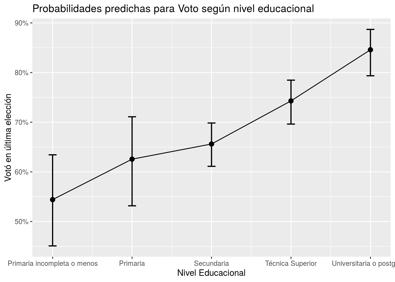 Una alternativa a las tablas de regresión son los coefplots. Como hemos visto en prácticas anteriores, este tipo de gráficos muestran el valor de coeficiente acompañados de sus intervalos de confianza. En este caso, vemos que la función plot_model nos entrega por defecto los coeficientes en unidades de odds-ratio, por tanto el valor 1 representa el límite para la significancia estadística, a diferencia del 0 cuando se encuentra en unidades de log-odds. En este caso, conforme a lo presentado en la tabla de regresión, el coeficiente de Edad y Educación Secundaria, Técnica superior y Universitaria poseen intervalos de confianza que no contienen el valor 1, por tanto son estadísticamente signficativos.