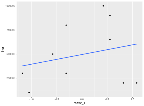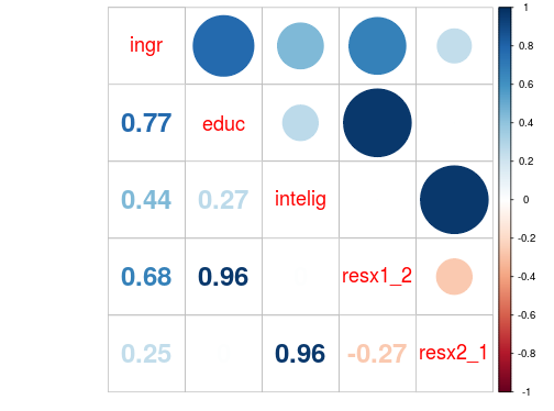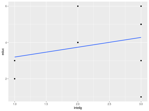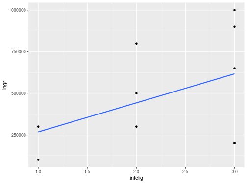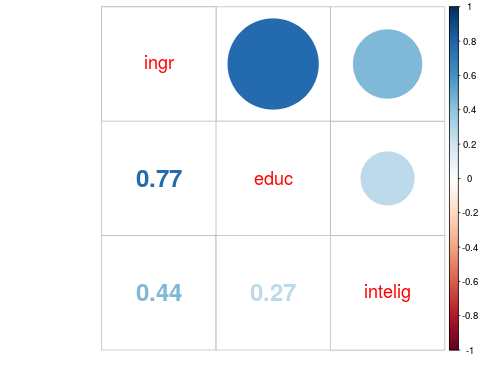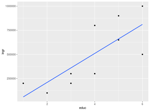 class: front <!--- Para correr en ATOM - open terminal, abrir R (simplemente, R y enter) - rmarkdown::render('static/docpres/07_interacciones/7interacciones.Rmd', 'xaringan::moon_reader') About macros.js: permite escalar las imágenes como [scale 50%](path to image), hay si que grabar ese archivo js en el directorio. ---> .pull-left[ # Estadística Multivariada ## Juan Carlos Castillo ## Sociología FACSO - UChile ## 1er Sem 2020 ## [multivariada.netlify.com](https://multivariada.netlify.com) ] .pull-right[ .right[  <br> <br> ## Sesión 6: Regresión múltiple (2) ] ] --- layout: true class: animated, fadeIn --- class: inverse, bottom, right, animated, slideInRight # **Contenidos** ## 1. Repaso de sesión anterior ## 2. Bases de control y parcialización ## 3. Demostración parcialización --- class: roja, middle, right # 1. Repaso sesión anterior --- .pull-left-narrow[ ## Base: Modelo de regresión (simple) <br> `$$\widehat{Y}=b_{0} +b_{1}X$$` .center[ ] ] .pull-right-wide[ - Se estima mediante el método de mínimos cuadrados ordinarios (OLS) - Permite estimar el valor de una variable ( `\(\widehat{Y}\)` ) a partir del valor conocido de otra variable ( `\(X\)` ) - La estimación se expresa en el coeficiente de regresión `\(b_{1}\)`, también llamado "beta" o pendiente - Este coeficiente se interpreta de la siguiente manera: Por cada unidad que aumenta X, Y aumenta en `\(b_{1}\)` unidades ] --- # Estadística multivariada - Hechos sociales: **multicausales**  --- # Regresión múltiple: más de 1 predictor `$$\widehat{Y}=b_{0}+b_{1}X_{1}+b_{2}X_{2}+b_{3}X_{3}+...+b_{k}X_{k}$$` -- .center[] --- # Regresión múltiple: más de 1 predictor - es un modelo **SUMATIVO** `$$\widehat{Y}=b_{0}+b_{1}X_{1}+b_{2}X_{2}+b_{3}X_{3}+...+b_{k}X_{k}$$` - para que esta suma tenga sentido, se deben descontar los aportes "duplicados" o que se traslapan entre predictores - es decir, si los predictores correlacionan, se debe **remover** la parte de la variable que correlacinoa con la otra variable - ## = Parcialización --- # Regresión múltiple: más de 1 predictor .pull-left[ .center[] .small[ `$$\widehat{Ingreso}=b_0+b_1(Educ)$$` ] ] -- .pull-right[ .center[] .small[ `$$\widehat{Ingreso}=b_0+b_1(Educ)+b_2(Int)$$` ]] --- .pull-left-wide[ ## Control estadístico - ¿Qué efecto posee el nivel educacional en ingreso, _controlando por_ inteligencia? ] .pull-right-narrow[  ] **Conceptualmente:** .small[ - aislar el efecto de educación en ingreso, manteniendo la inteligencia _constante_. - estimar el efecto de educación en ingreso independiente del efecto de la inteligencia - estimación del efecto de educación en ingreso _ceteris paribus_ (manteniendo el efecto del resto de los predictores constante) ] --- # Ejemplo .center[] .small[Castillo, J., Miranda, D. & Madero, I. (2013) Todos somos de clase media: Sobre el estatus social subjetivo en Chile. _Latin American Research Review_ 48(1) 155-173 ] --- class: inverse ### RESUMEN - Los coeficientes de regresión (X) no alteran su valor en los modelos en ausencia de correlación entre ellos - Si hay correlación entre predictores, el valor de los coeficientes de regresión será distinto en modelos simples y en modelos múltiples - Por ello, en regresión múltiple se habla de coeficientes de regresión **parciales** --- class: roja, middle, center # 2. Bases de control y parcialización --- # Ejemplo (mínimo): Datos .medium[ ``` ## ID ingr educ intelig ## 1 1 100000 2 1 ## 2 2 200000 1 3 ## 3 3 200000 3 3 ## 4 4 300000 3 1 ## 5 5 300000 4 2 ## 6 6 500000 6 2 ## 7 7 650000 5 3 ## 8 8 800000 4 2 ## 9 9 900000 5 3 ## 10 10 1000000 6 3 ``` ] --- # Ejemplo: Descriptivos .medium[ <table style="text-align:center"><tr><td colspan="8" style="border-bottom: 1px solid black"></td></tr><tr><td style="text-align:left">Statistic</td><td>N</td><td>Mean</td><td>St. Dev.</td><td>Min</td><td>Pctl(25)</td><td>Pctl(75)</td><td>Max</td></tr> <tr><td colspan="8" style="border-bottom: 1px solid black"></td></tr><tr><td style="text-align:left">ID</td><td>10</td><td>6</td><td>3</td><td>1</td><td>3.2</td><td>7.8</td><td>10</td></tr> <tr><td style="text-align:left">ingr</td><td>10</td><td>495,000</td><td>323,565</td><td>100,000</td><td>225,000</td><td>762,500</td><td>1,000,000</td></tr> <tr><td style="text-align:left">educ</td><td>10</td><td>4</td><td>2</td><td>1</td><td>3</td><td>5</td><td>6</td></tr> <tr><td style="text-align:left">intelig</td><td>10</td><td>2</td><td>1</td><td>1</td><td>2</td><td>3</td><td>3</td></tr> <tr><td colspan="8" style="border-bottom: 1px solid black"></td></tr></table> ] --- # Ejemplo: correlaciones .pull-left[.small[ ``` ## ingr educ intelig ## ingr 1.00 0.77 0.44 ## educ 0.77 1.00 0.27 ## intelig 0.44 0.27 1.00 ``` ] ] -- .pull-right[ <!-- --> ] --- .pull-left[ **Ingreso <- educación ( `\(X_1\)` )** <!-- --> ] .pull-right[ **Ingreso <- intelig ( `\(X_2\)` )** <!-- --> ] --- # Ejemplo: scatter X1 X2 .pull-left[ <!-- --> ] .pull-right[ .medium[ - presencia de correlación entre predictores - idea de control estadístico: ¿Cuál es la influencia de educación en ingreso, independiente de la inteligencia? - **controlando por** inteligencia ]] --- # Regresión .small[ ] .small[ <table cellspacing="0" align="center" style="border: none;"> <caption align="bottom" style="margin-top:0.3em;"> </caption> <tr> <th style="text-align: left; border-top: 2px solid black; border-bottom: 1px solid black; padding-right: 12px;"><b></b></th> <th style="text-align: left; border-top: 2px solid black; border-bottom: 1px solid black; padding-right: 12px;"><b>Model 1</b></th> <th style="text-align: left; border-top: 2px solid black; border-bottom: 1px solid black; padding-right: 12px;"><b>Model 2</b></th> <th style="text-align: left; border-top: 2px solid black; border-bottom: 1px solid black; padding-right: 12px;"><b>Model 3</b></th> </tr> <tr> <td style="padding-right: 12px; border: none;">(Intercept)</td> <td style="padding-right: 12px; border: none;">-91566.27</td> <td sty